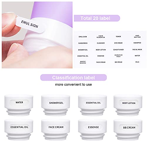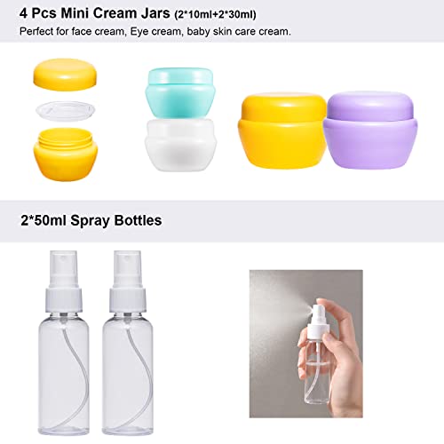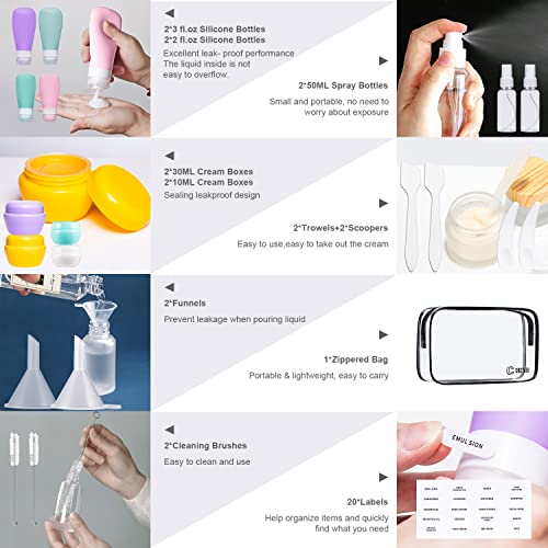 ✅【TRAVEL COMPANION】This hand sanitizer travel bottle set includes 4 pcs silicone bottles (2*2fl.OZ + 2* 3fl.OZ ) for conserving shampoo or detergent, 2 EMPTY spray bottles (50ml) for perfume or moisturizer, 4 cream jars (2*10ml+2*30ml) for moisturizing cream and 2 funnels + 2 trowels +2 scoopers + 2 cleaning brushes + 1 page label + 1 PVC bag.
