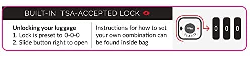 Recessed 3-dial TSA approved combination lock for security; unique brake system locks two front wheels to prevent bag from rolling away