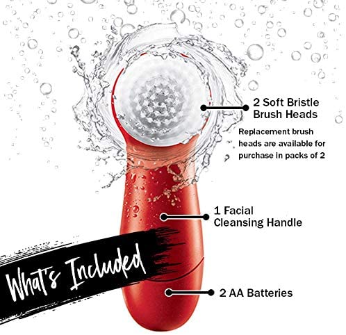 INCLUDES: 1 facial cleansing device handle, 2 soft bristle brush heads, 2 AA batteries