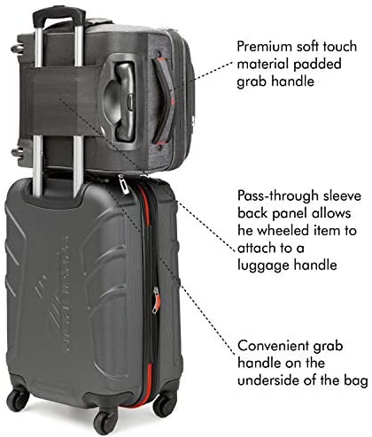Pass-through sleeve back panel allows the wheeled item to attach to a luggage handle. Convenient grab handle on the underside of the bag.