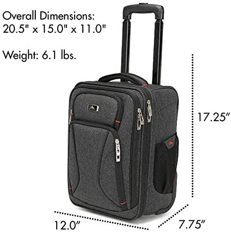 This underseat carry on luggage with wheels is designed to fit under an airplane seat or in most airlines overhead compartments