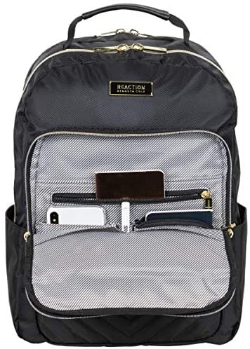 Sleek and sophisticated, this chevron quilted laptop backpack from Kenneth Cole Reaction is perfect for professionals on the go. Features a roomy fully lined interior with multiple interior pockets for all your needed essentials. Loaded with features, including a separate padded laptop compartment that holds most laptops with up to a 15-inch screen, a padded tablet pocket in the main compartment, multiple zippered accessory pockets, and dual exterior beverage holster pockets. The exterior features a trolley tunnel to fit over luggage trolley handles for hands free carrying, and a sturdy padded top handle for easy carrying. The perfect fashion-forward laptop backpack to keep your business essentials fashionably organized while on the go. ★ Overall size: 16” H x 11” W x 7.5” D. ★ Computer Compartment Size: 15.25” H x 10” W X 1.75” D. ★ Product Weight: 2.15 lbs. ★