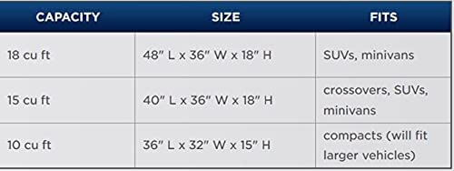 X-LARGE CAPACITY DESIGN: 18 cubic feet of storage, 48″ L x 36″ W x 18″ H; designed for SUVs and minivans.